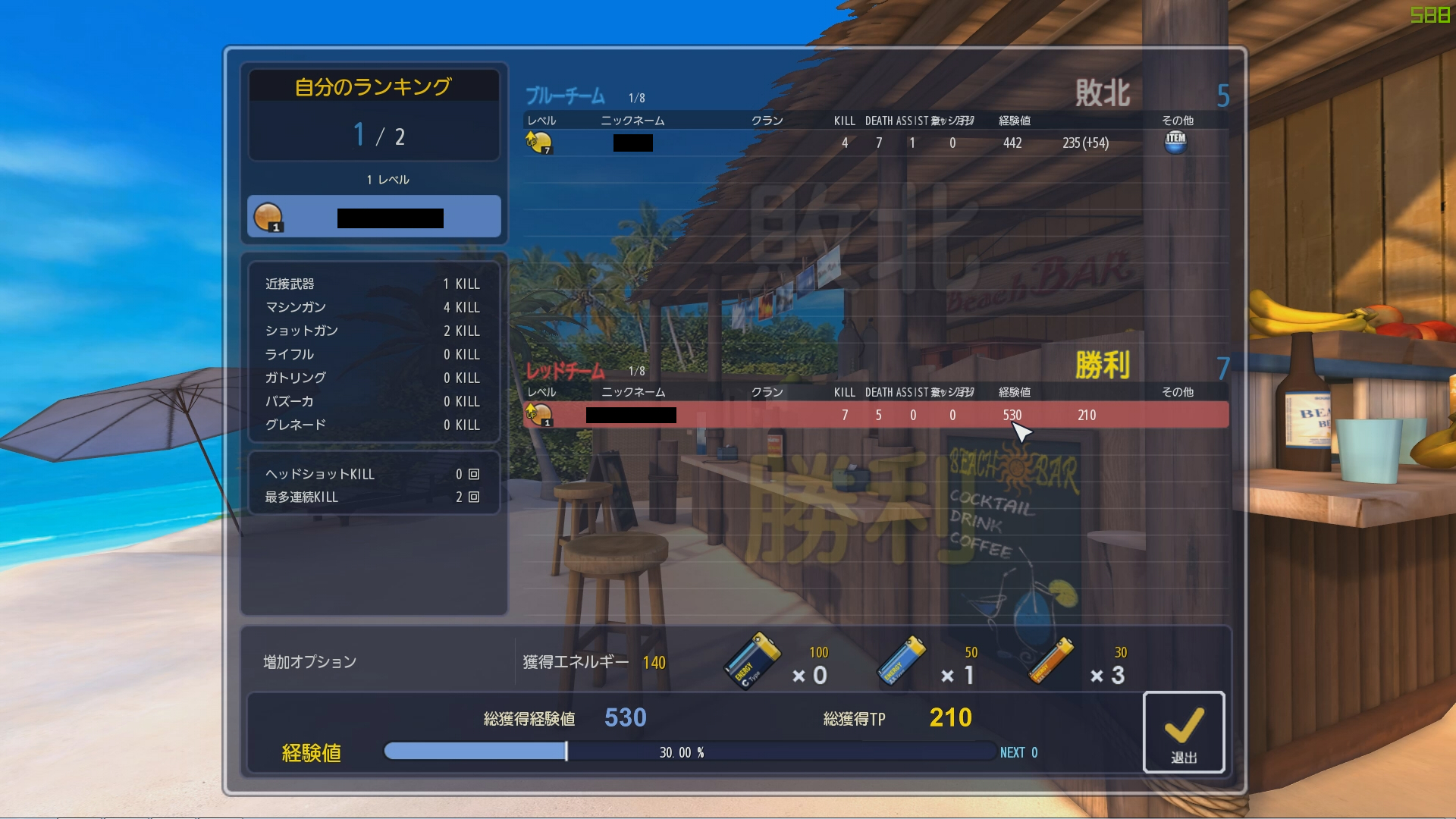 リザルト画面です。下のレッドチームがれんつ。